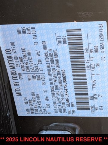 Nautilus Reserve, 4D Sport Utility, 2.0L GTDI FHEV, CVT, AWD, Black Metallic, Light Smoked Truffle Leather, 10 Speakers, 110V Power Converter, Adaptive suspension, Apple CarPlay/Android Auto, Auto Air Refresh, Auto High-beam Headlights, Auto tilt-away steering wheel, Auto-dimming Rear-View mirror, Black Exterior Elements, BlueCruise Equipped (4-Years Included), Body Color, Brake assist, Digital Scent, Electronic Stability Control, Emergency communication system: 911 Assist, Equipment Group 203A Reserve III, Exterior Parking Camera Rear, Front Bucket Seats, Fully automatic headlights, Garage door transmitter: HomeLink, Hands-Free Power Liftgate, Heated front seats, Heated steering wheel, Illuminated entry, Jet Appearance Package, Leather steering wheel, Lincoln Rejuventate, Low tire pressure warning, Navigation System, Outside temperature display, Panoramic Vista Roof w/Powershade, Power Liftgate, Premium Leather-Trimmed Heat/Vent Captain's Chairs, Radio: AM/FM Revel Ultima 3D Audio System, Rear Heated Seats w/Switch Control, Remote keyless entry, Security system, Speed-sensing steering, Spoiler, Steering wheel memory, Steering wheel mounted audio controls, Telescoping steering wheel, Turn signal indicator mirrors, Wheels: 22" Satin Dark Luster Aluminum.